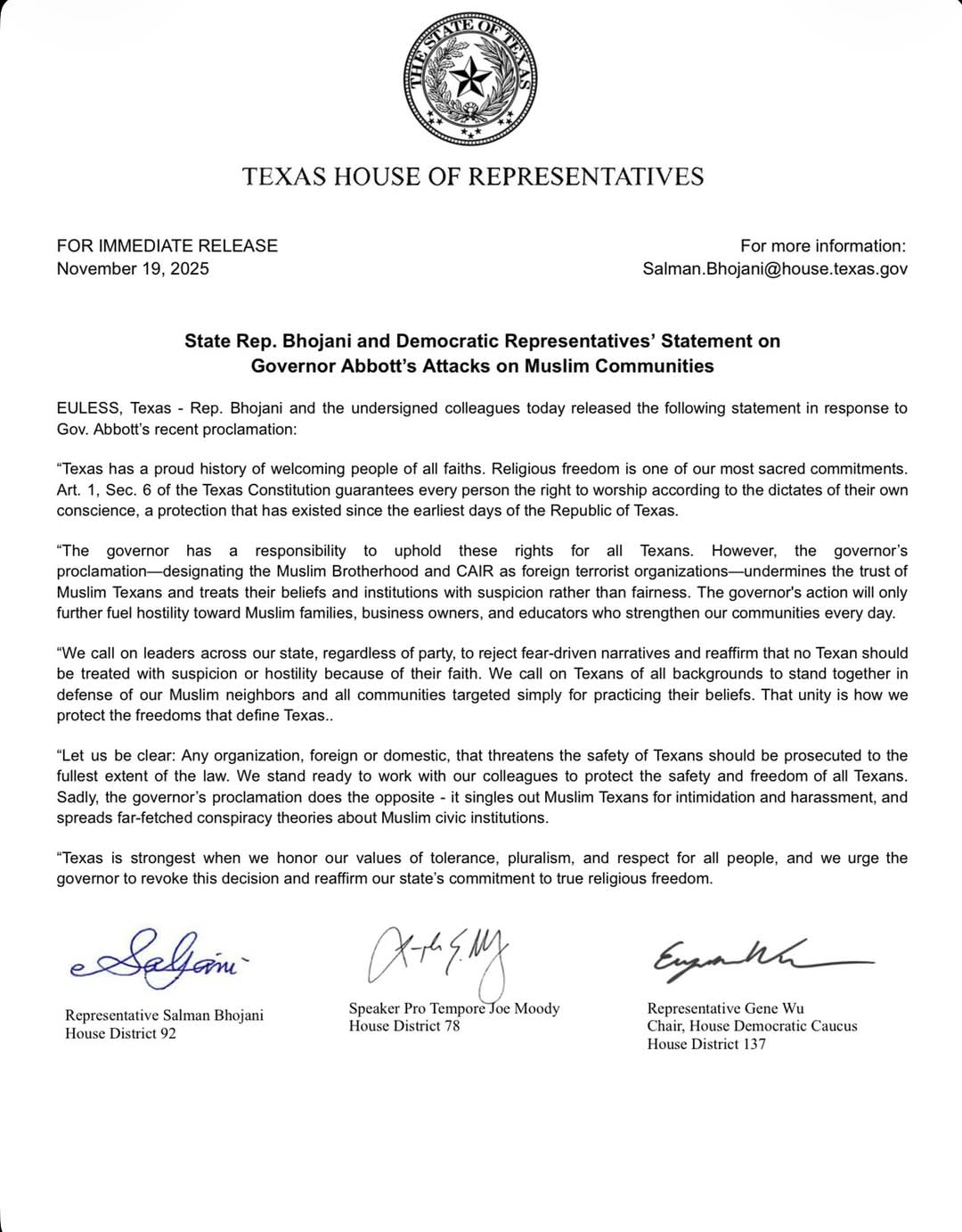 Rep. Bhojani later reiterated the message, saying Texas’ commitment to pluralism was under attack. “My Texas House colleagues and I are calling on Governor Abbott to reverse this harmful proclamation and recognize that Muslim Texans deserve the same dignity, trust, and freedom as every other faith community,” he said.