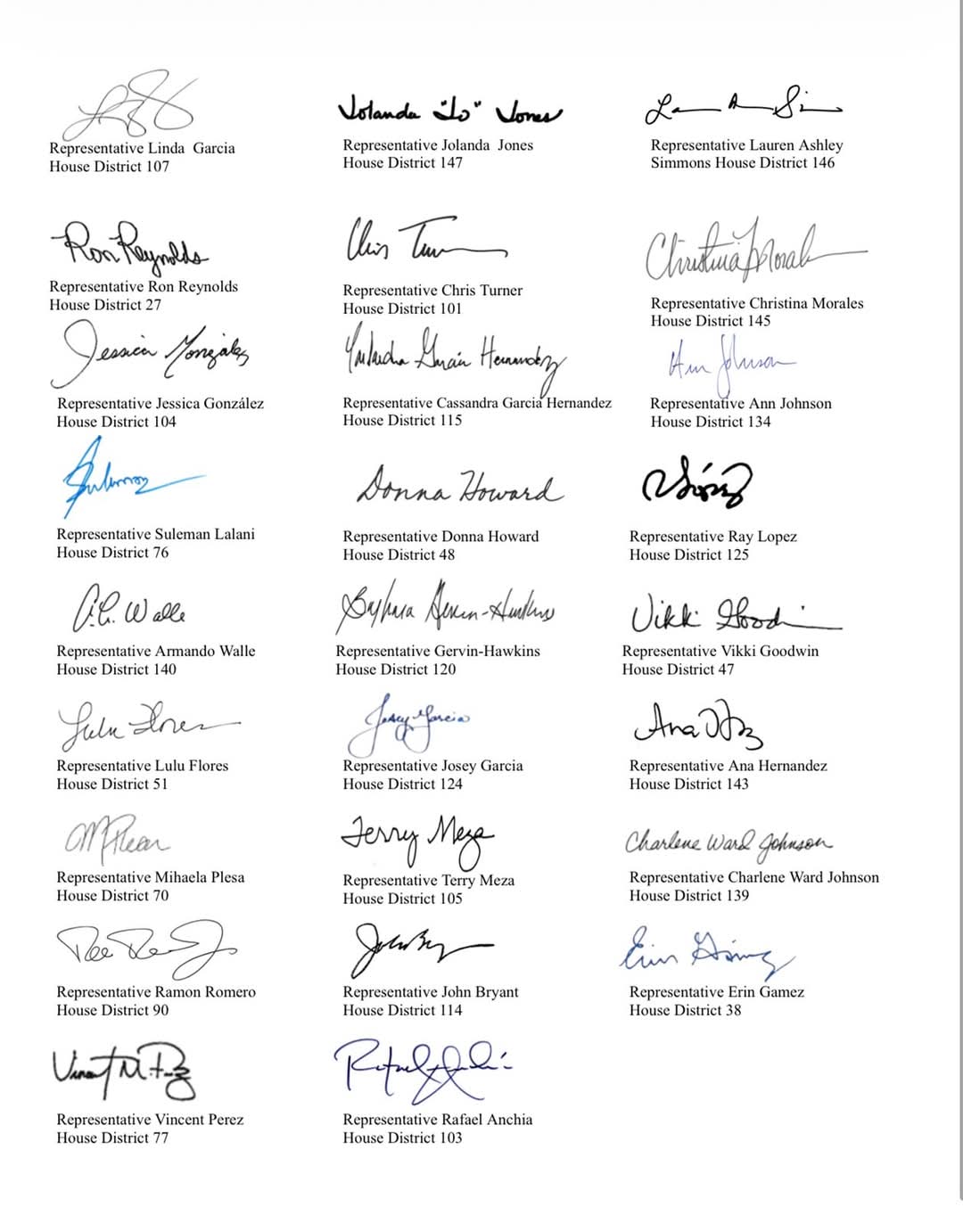 The statement was co-signed by Rep. Salman Bhojani (HD 92), Speaker Pro Tempore Joe Moody (HD 78), and Rep. Gene Wu, Chair of the House Democratic Caucus (HD 137).